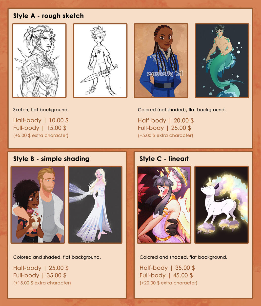 The prices are in Euros.PAYPAL only.If you cancelled before the sketch is finished, it will be refunded 100%. If you cancelled after the sketch is finished, it will be refunded 50%, finished or near-finished commission cannot be canceled.